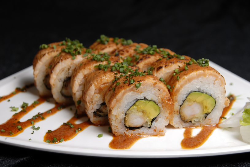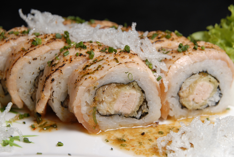 Camarón tempura y palta env. en finos cortes de salmón flambeado con salsa anticucho al miso
