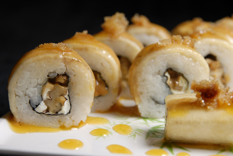 Pollo teriyaki, queso crema, cebollín env. en almendras confitadas en salsa unagui