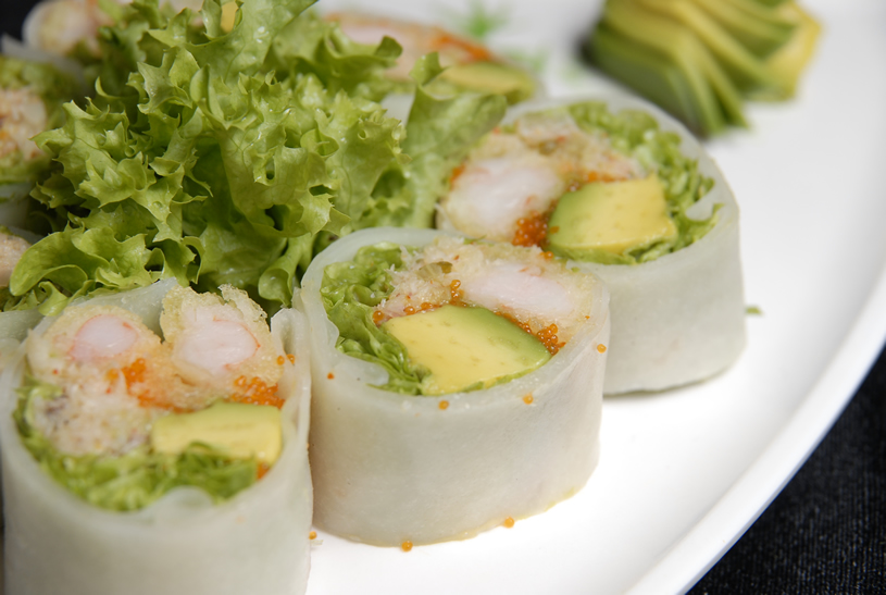 Camarón tempura, cangrejo, masago, palta y lechuga envuelto en hoja de arroz