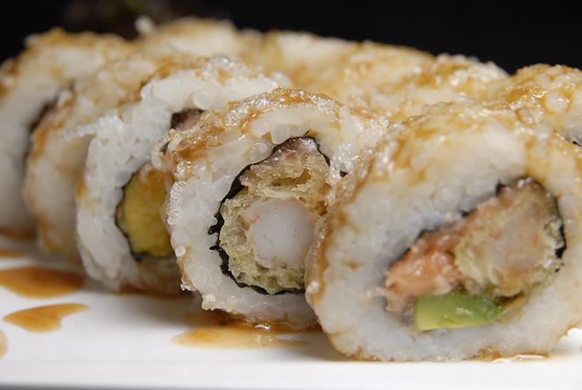Camarón tempura, palta cubierto de exquisito lomo saltado al estilo Japón Ya