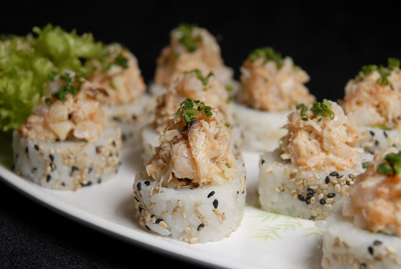 Camarón tempura, palta, tartar de cangrejo, salmón, camarón, ostión y salsa de maracuyá