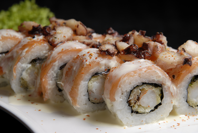 Tartar de pulpo, palta y cebollín env. en salmón flambeado con salsa olivar y tira maki